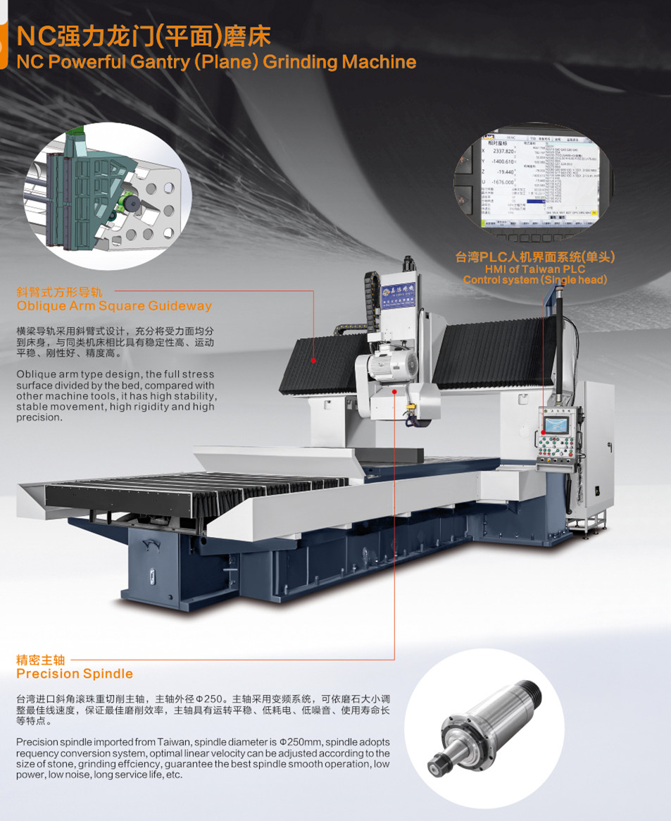 一次研磨進(jìn)刀量可達(dá)0.08MM。研磨往返速度可達(dá)25M/min。采用臺灣進(jìn)口斜角滾珠重切削普森主軸。X軸底座大中心跨距,一平一V設(shè)計,增強機床切削鋼性和穩(wěn)定性。機床橫梁加寬、加厚,斜臂式導(dǎo)軌,增強機床切削的穩(wěn)定性。