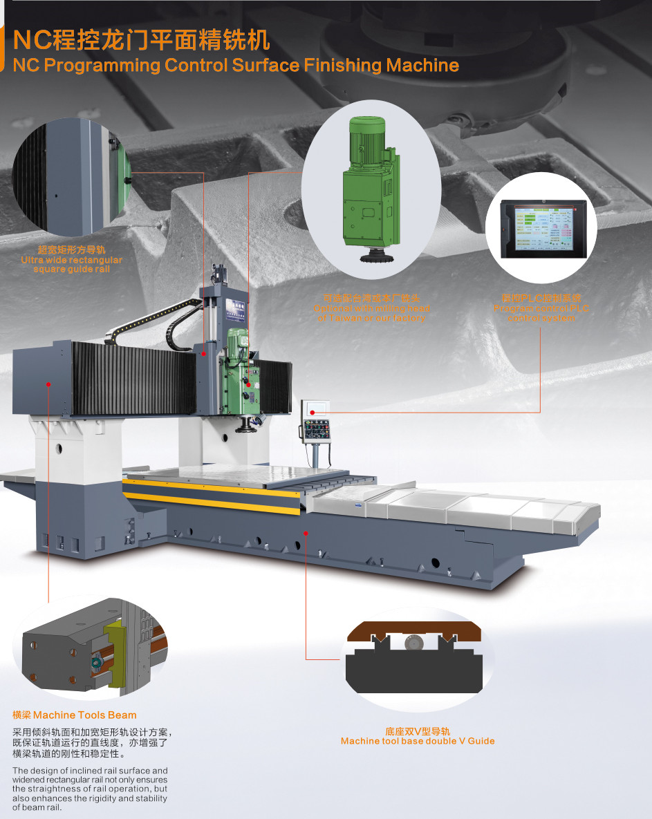 This machine is NC planar precision milling machine with fixed beam, which is equipped with feed frequency conversion speed regulation system and spindle large torque shift speed regulation, and multi-axis control (vertical movement of worktable, lateral movement of vertical milling head, vertical milling head lifting and moving). Automatic processing, automatic positioning, intelligent industrial control, processing steel plate, both sides of the plane rough and fine processing as one, such as heavy cutting die blank, high precision, boring and milling processing application processing equipment.