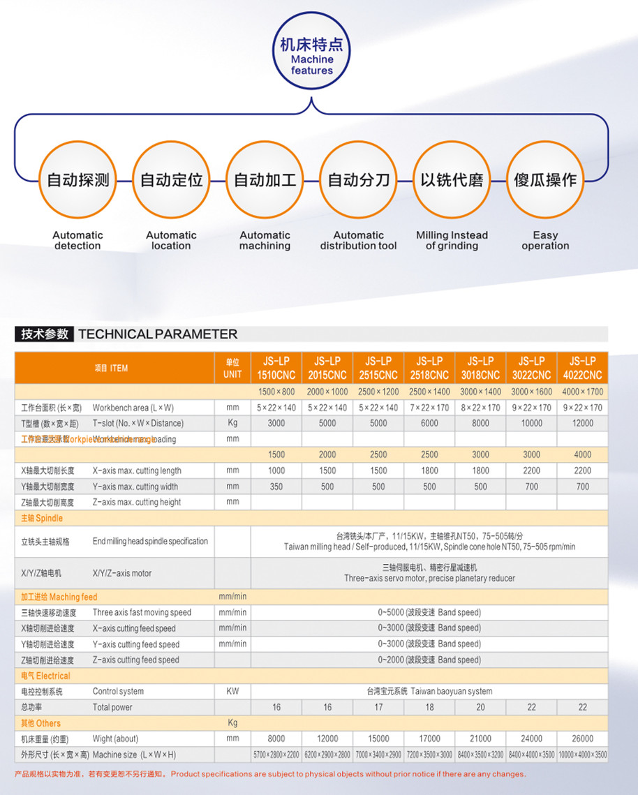 This machine is a fixed-beam CNC planar fine milling machine, equipped with feed servo drive speed system and spindle torque shift speed regulation, multi-axis control (table longitudinal movement, vertical milling head lateral movement, vertical milling head lifting movement). Automatic detection, automatic processing, automatic positioning, CNC intelligent, milling instead of grinding, processing steel plate, both sides of the plane rough and fine processing as one, heavy cutting die blank, high precision, boring and milling machining application processing equipment.